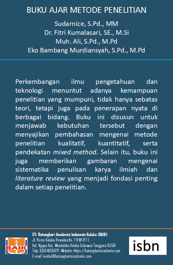Buku ajar ini disusun dengan pendekatan yang komprehensif, mencakup metode penelitian kualitatif, kuantitatif, dan mixed method, serta memberikan arahan sistematis tentang penulisan karya ilmiah dan literature review. Penyajian materi yang sederhana dan sistematis menjadikan buku ini relevan, tidak hanya bagi mahasiswa yang sedang menyusun skripsi, tetapi juga bagi dosen dan peneliti yang ingin memperdalam metodologi penelitian.